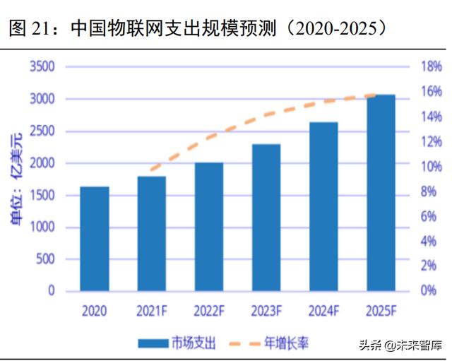 根据 IDC 研究数据,2020 年全球物联网支出达到 6905 亿美元,其中中国市场占比 23.6%。IDC 预测, 到 2025年全球物联网市场将达到1.1万亿美元,年均复合增长率11.4%,其中中国市场占比将提升至25.9%, 达到 3070 亿美元,年均复合增长率达到 13.4%,成为第一大物联网市场。