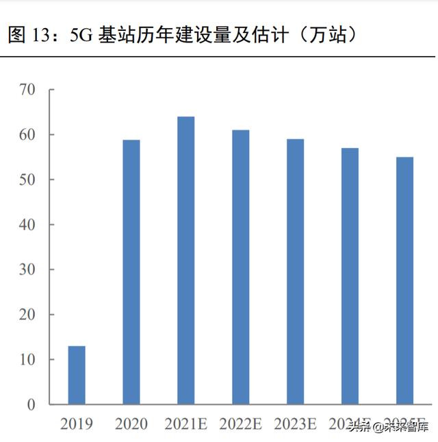 根据工信部《“十四五”信 息通信行业发展规划》,到 2025 年每万人拥有 5G 基站数达到 26 个,按照第七次人口普查数据测算,预计 到 2025 年 5G 基站数约为 370 万座,2024-2025 年平均每年新建约 57.5 万座,后续 5G 建设将稳步推进。随 着全覆盖的实现,5G 建设将进入深度覆盖阶段,预计运营商 2022 年资本开支温和增长,建设的重心也将 从无线接入网转向传输和核心网。