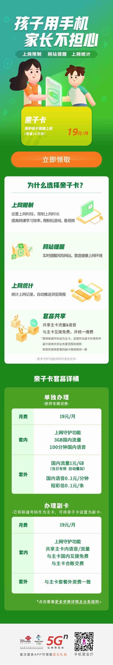 亲子卡支持单独办理,也支持当副卡使用,月费均为19元,都支持上网守护功能。