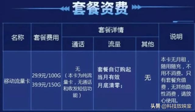 这款资费套餐共分为两档,分别是29.9元100G与39.9元150G。值得注意的是,这仅仅是一款流量资费套餐,并不包含通话以及短信功能。并且这款套餐资费不具有月租费,随时使用随时进行充值。除此之外,该套餐并无其他额外的任何资费,开卡费需要交纳49元。多种迹象表明,这仅仅是中国移动推出的一款物联卡,并不具备语音通话功能,仅供用户上网使用(100G流量将会匹配4G网络速度,不会有任何的限速问题)。