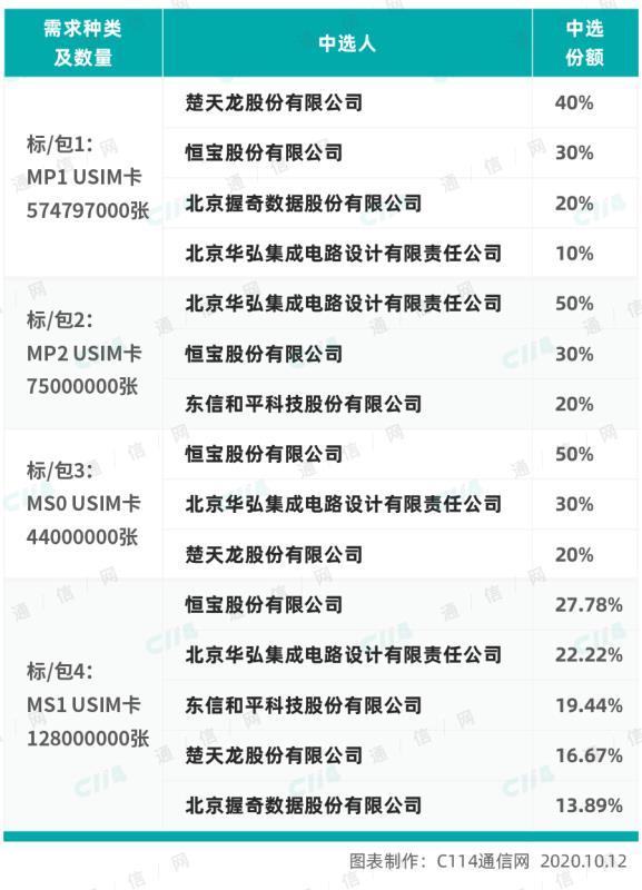 根据此前发布的招标公告,该项目采购物联网USIM卡共计8.2亿张,其中MP1 USIM卡需求574797000张,MP2 USIM卡需求75000000张,MS0 USIM卡需求44000000张,MS1 USIM卡需求128000000张。
