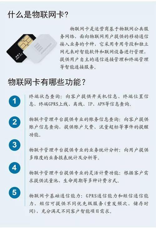 物联网卡与普通的SIM卡在外观上并无二致,拥有专属的号段和网元设备,功能上可以实现无线联网、收发短信等功能。