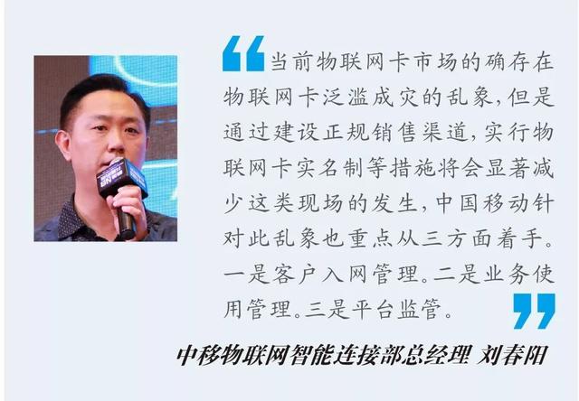 中移物联网智能连接部总经理刘春阳表示,当前个人和企业都可以通过营业厅等多个渠道购买到中国移动物联网卡,对于物联网卡乱象,中国移动也将进一步加强对物联网卡的监管、透明物联网卡资费,助力物联网卡市场良性发展。
