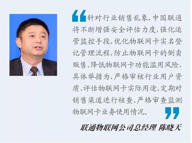 据了解,针对行业销售乱象,陈晓天表示,中国联通将不断增强安全评估力度,强化运营监控手段,优化物联网卡实名登记管理流程,防止物联网卡的倒卖贩售,降低物联网卡功能滥用风险,具体举措为,严格审核行业用户资质、评估物联网卡实际用途、定期对销售渠道进行核查、严格审查监测物联网卡业务使用情况。