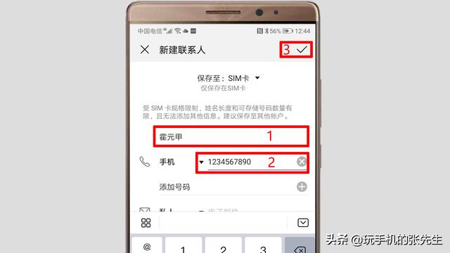 5、然后分别键入联系人姓名和手机号码,再点击右上角的“确认”图标,即可将联系人保存到SIM卡中。