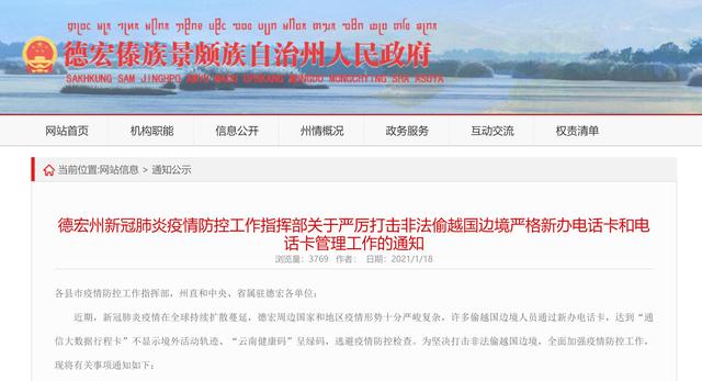 近日,云南德宏傣族景颇族州新冠肺炎疫情防控工作指挥部发布通知,进一步严格新办电话卡和电话卡管理工作,严厉打击非法偷越国边境者通过新办电话卡逃避检查,加强边境疫情防控。