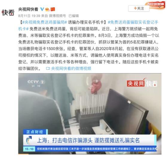 【央视揭免费送鸡蛋骗局 诱骗办理实名手机卡】免费送米免费送鸡蛋,背后可能是陷阱。近日,上海警方就侦破一起用免费油、米等骗取实名登记手机卡的犯罪案件。8月3日,上海警方成功捣毁一个以免费送礼物骗取实名登记手机卡的犯罪团伙,抓获以管某为首的5名犯罪嫌疑人,当场缴获电话卡1500余张。经查,管某等人自2020年8月起,在没有获取通讯公司授权的情况下,以赠送油、米等方式,诱骗他人使用真实身份办理电话卡实名登记,并以需要激活手机卡等各种理由,强行留下电话卡。随后这些手机卡被卖给诈骗团伙。
