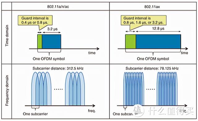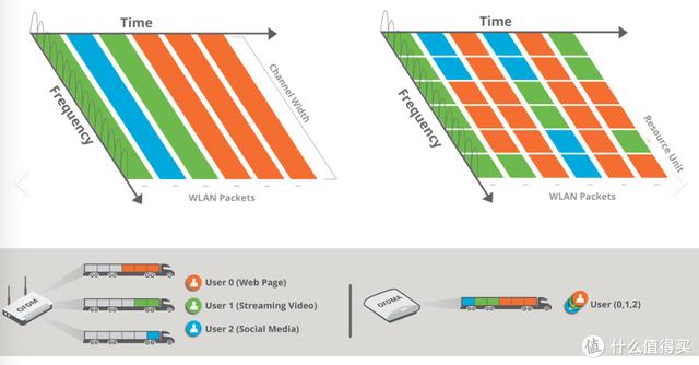 Wi-Fi6使用了OFDMA技术,相比于Wi-Fi5路由器使用的OFDM技术一次只对一个用户传输一份数据,使用OFDMA技术的Wi-Fi6路由可以将数据分割成更小,一次给多个用户传输多个数据,提高了信道利用率,多用户同时上网互不耽误。