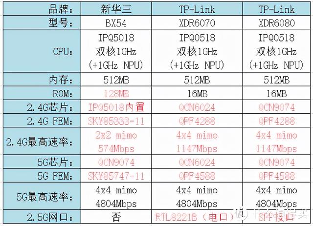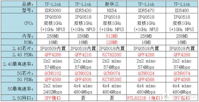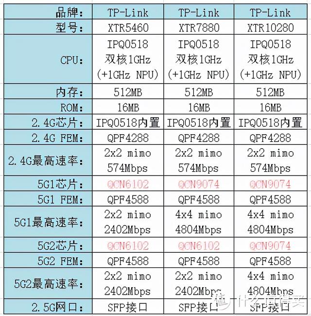 上图汇总了三款三频Wi-Fi6路由器的配置信息,主要区别的地方已用红色字体标出。论性价比,自然是最便宜的XTR5460较好,2x2 mimo够用实用!有钱任性随意!