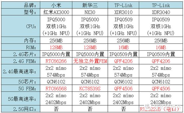 上图汇总了四款入门Wi-Fi6路由器的配置信息,主要区别的地方已用红色字体标出。4款路由都是双频Wi-Fi6路由,2.4G和5GWi-Fi都支持Wi-Fi6,都是2x2 mimo。高通IPQ5000这套Wi-Fi6方案,暂时没有第三方固件,所以128MB的ROM暂时也只是精神安慰。4款产品中就红米AX3000的无线信号稍弱一点点,其余三款无线信号强度基本一致,没有mesh组网需求的话(不同品牌的mesh路由不能相互组mesh),四款产品中哪款便宜买哪款就对了。