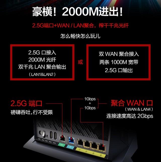 抛开诸如配置,收发速率,天线等一系列参数不谈,光是2.5G网口,GT-AX6000就一口气配备了两个,一进一出,就是2000M光纤也不在话下。这下不管是发烧达人还是土豪,都能玩个痛快了。