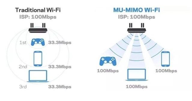 MU-MIMO技术允许多个设备同时与路由器通信,无需排队等待。但与OFDMA不同的是,OFDMA通过细分信道允许与多用户通信,而MU-MIMO通过使用不同的空间流与多用户通信,就比如说2×2MIMO、4×4MIMO、8×8MIMO,数字就代表着天线和空间流。比如8×8MIMO就代表着8个发射天线和8个接收天线组成的8个空间流。