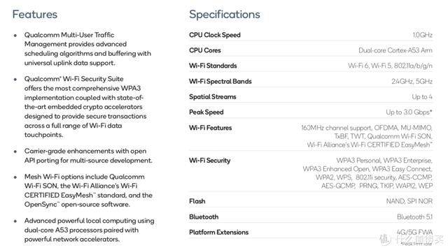 和MTK的MT7622芯片相似,IPQ5000系列芯片也整合了2.4G无线芯片功能,提供2x2mimo的2.4G Wi-Fi 6支持,最高速率574Mbps。搭配QCN6102这颗2x2 mimo 5G Wi-Fi6无线芯片(支持160MHz,最高速率2402Mbps)后,就组成为AX3000入门Wi-Fi6方案了。该方案的优点有: