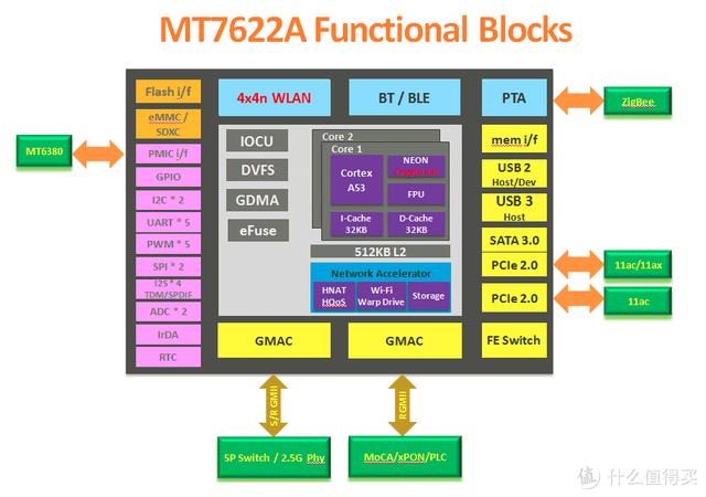 1、比起MIPS架构的MT7621,A53架构的MT7622B性能大跃进,并提供硬件NAT功能;