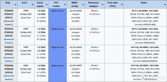 IPQ5000、IPQ0509、IPQ5010、IPQ5018这几个芯片性能差异不大,都是A53架构的双核处理器,其中IPQ5000、IPQ0509、IPQ5018的运行频率低点只有1GHz,IPQ5010的运行频率高点可达到1.2GHz。它们都整合了一个1GHz频率的NPU单元,专门用于NAT,以减轻处理器负担。IPQ5000、IPQ0509、IPQ5010整合了256MB内存,而IPQ5018则没有。