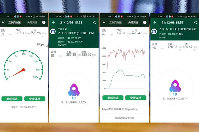 继续在书桌前测试网络,不论是外网,还是内网的网速,测试结果都非常高,外网最高下载速度可以接近 400Mbps,和我家 500M 的入户带宽差不多。实测内网的上传速度也很强,对于这样的信号结果,我个人是非常满意的。