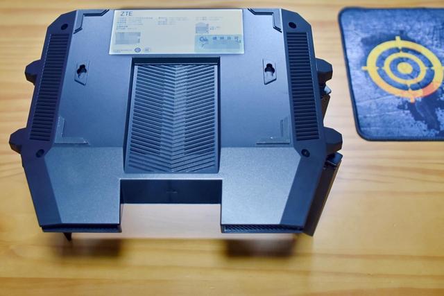 底部有防滑橡胶脚垫,也预留了壁挂螺丝孔,中间和侧面都使用了大面积的散热格栅,有利于路由器在工作中散热。