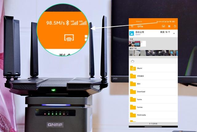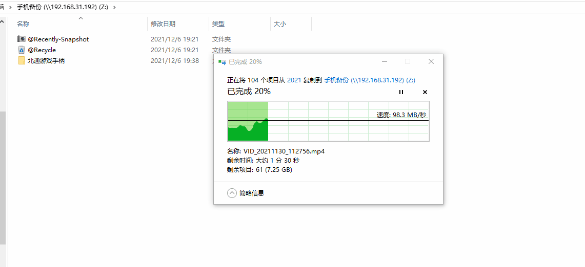 使用手机和 NAS 传输数据,传输速度可以达到 100M/s ,接近 1000Mbps 的带宽,体现了 WiFi6 的高速网络性能。