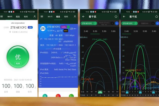 使用「WiFi魔盒」APP 测试路由器信号,可以看出路由器支持 160MHz 频宽,WiFi6 协议。