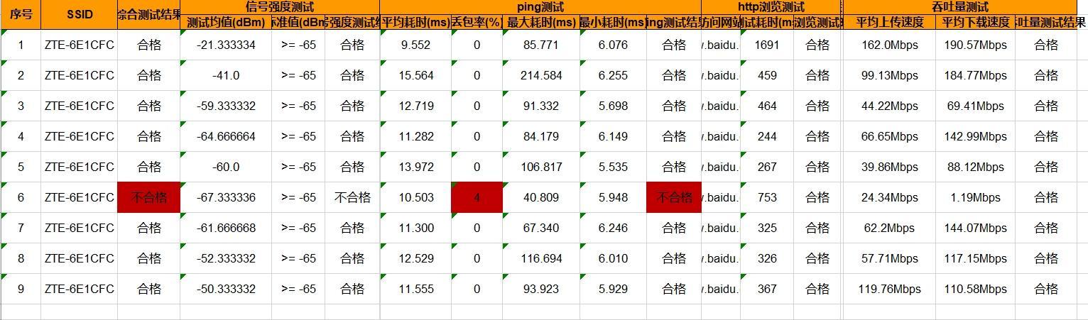 这是不同测试点的详细数据,第 6 点因为丢包率导致测试不合格,同时它的下载和上传速度也是最差的。通过数据对比,可以看出从第 2 点到第 5 点,下载速度依次下降,因为它们需要穿墙越来越多,而第 7 点到第 9 点的下载和上传速度较好是因为可以使用反射传来的信号。