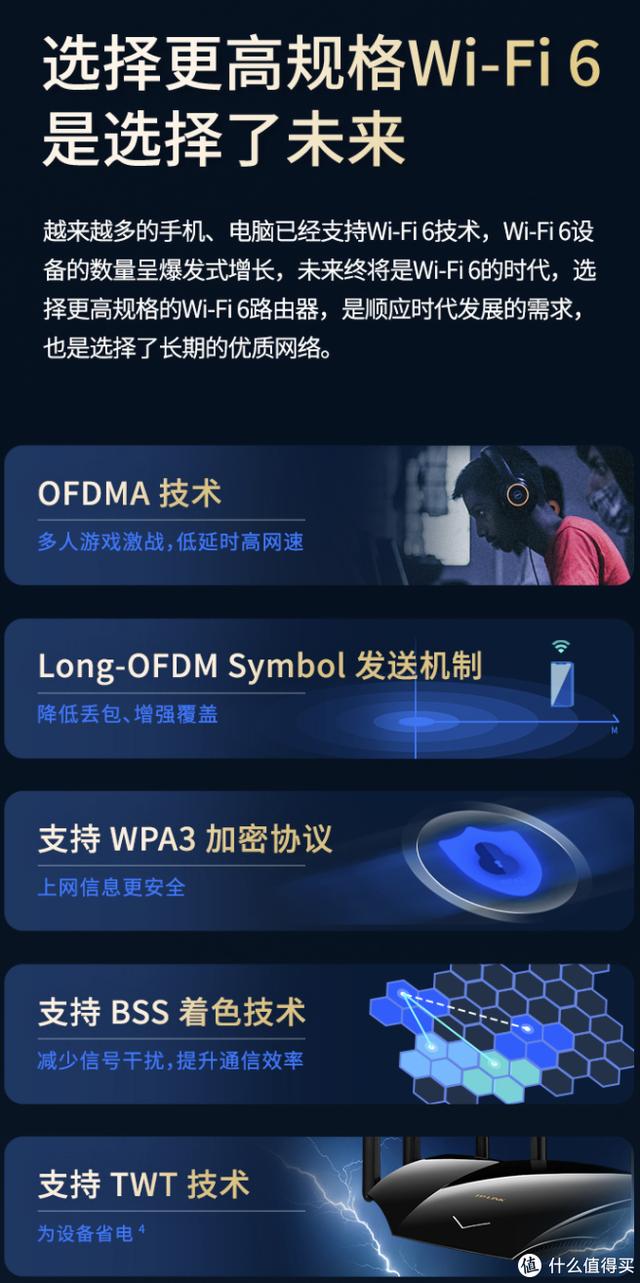 2、由于WiFi6拥有OFDMA和MU-MIMO两大技术,对多终端环境支持更好,加上WiFi6终端已经进入高速普及阶段,因此本次只推荐WiFi6路由器。 (但是真正需要这两种技术支持的智能家居环境,厂家似乎还在节约成本使用WiFi4,真是不求上进!)