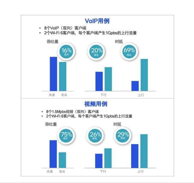 从测试结果来看,高通高性能Wi-Fi 6网络调度器成功地将VoIP流量时延降低了60%(与传统的SU模式相比)。而与竞品相比,高通专业联网平台的调度器在有VoIP用户或视频用户的情况下,为大流量客户端带来高达70%的吞吐量提升,而VoIP流量和交互式视频流量场景的时延降低高达69%(在上行链路中)。