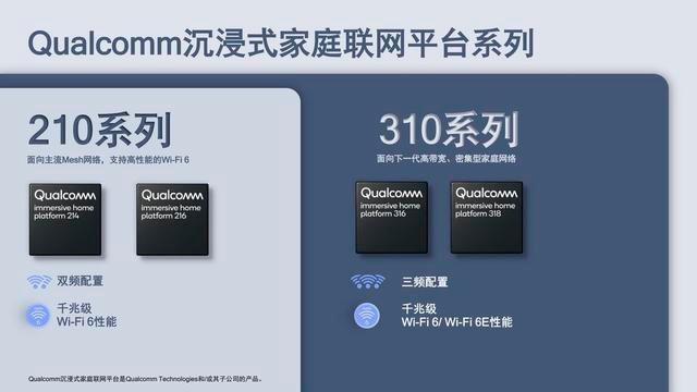 而面向全屋覆盖千兆级无线连接的用户需求,高通全新沉浸式家庭联网平台同样发挥着重要作用,该平台主打小巧、沉浸式、低功耗和低成本,目前共有两个系列的解决方案,分别是高通310沉浸式家庭联网平台系列和高通210沉浸式家庭联网平台系列。其中,高通310沉浸式家庭联网平台系列支持Wi-Fi 6和6E,理论最高总速率达到了7.8Gbs(998.4MB/s)。沉浸式家庭联网平台集合高通在Wi-Fi 6和6E领域的全部新特性,可以为家中任何一个角落提供高质量网络覆盖,改变用户体验。