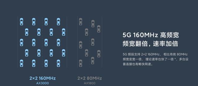 Wi-Fi 6 的 5G 频段支持 2x2 160MHz 带宽,比传统的 80MHz 频宽提升一倍,速率也大幅提升。