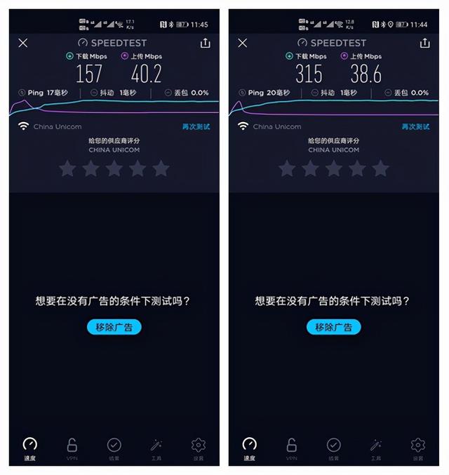 蒲公英X5支持双频WiFi,这款路由器的无线速度高达1800Mbps。笔者家中的宽带是300兆联通宽带,手机设备为荣耀30 Pro,支持WiFi 6,通过测速软件SPEEDTEST测速,在5G频段下,最高下载速度为315Mbps,上传为38Mbps。2.4G模式下,最高下载速率为157Mbps,上传为40Mbps,这样的测试结果,要远远高于此前家里的普通的千兆路由器。速度提升效果非常理想,几乎跑满了联通300兆宽带的极限。