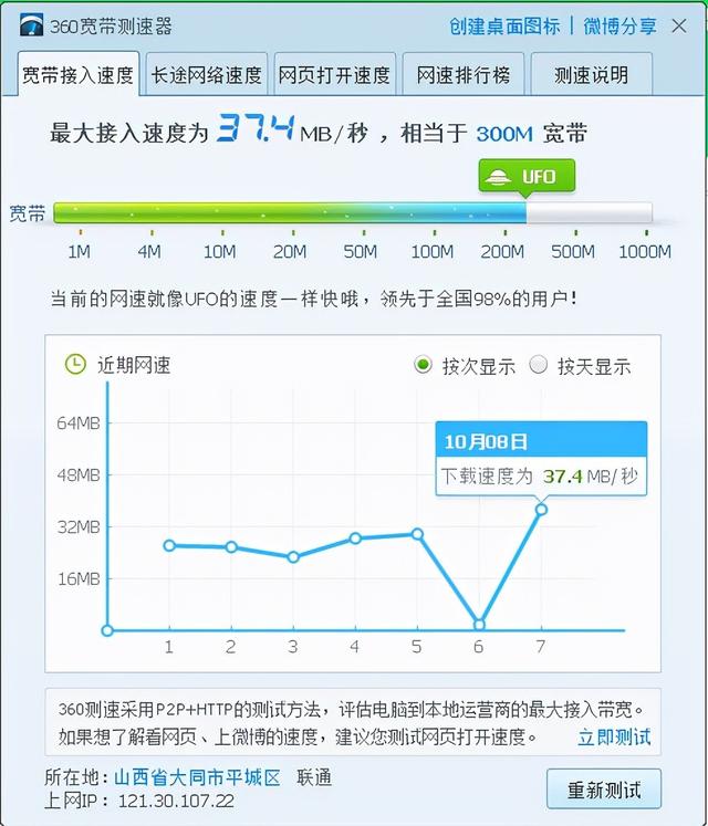 而通过网线连接,测速可以达到37.4MB/s,达到了300兆的宽带速度。