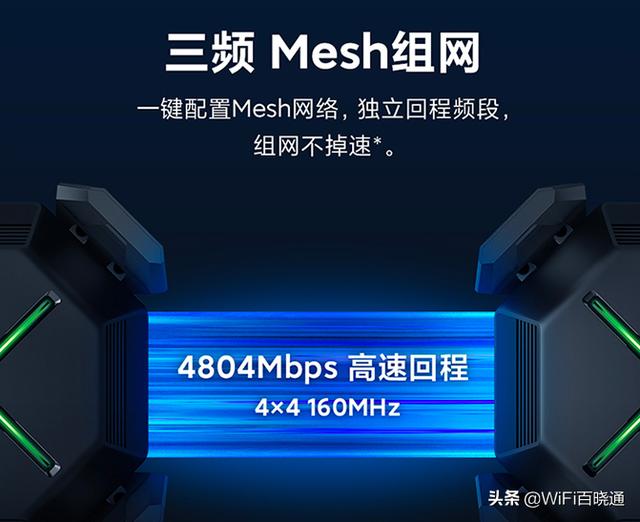 - 三频WiFi6,旗舰级体验:2.4G、5G1、5G2三个频段都是4x4,一共12路空间流;三频的使用体验相比双频优势很大;