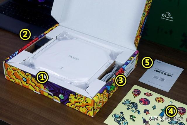 先做个简单开箱。锐捷星耀X32拿出一个礼盒范儿的包装盒,而且这斑斓色彩让人看过后倍感年轻。下图可见主机①外,还有②电源适配器、③千兆网线、⑤说明书以及一张航天元素跑满的贴纸,不喜欢单调色彩的朋友,可以把锐捷星耀X32装点得更漂亮。