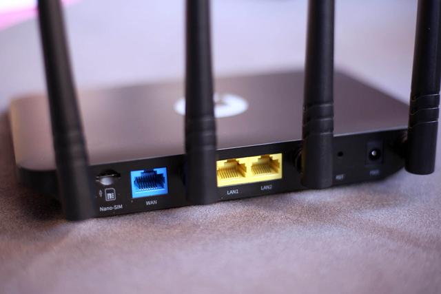 接口方面采用了一入两出的设计,蓝色的是外网接入的WAN口,虽然这是一款主打4G网络的路由器,但是他也能够当作普通的路由器来使用的。而两个黄色的LAN口则是用来连接有线设备的。而在最左侧则有一个SIM卡插槽,在这里可以插入手机卡,利用手机卡中的4G网络来为路由器提供能够联网的WiFi信号。