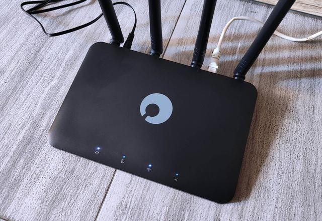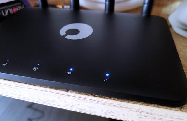 这款路由器有两种使用方式。第一种就是常见的有线组网。只需要把宽带网线插到路由器的WAN口端就可以了。可以看到,路由器的上面有四个指示灯。其中最右边的那个指示灯,就是4G网络信号的。如果使用有线网络,它就是灭的,而只有使用4G卡组网的时候,它才会常亮,用来提示SIM卡的信号连接。