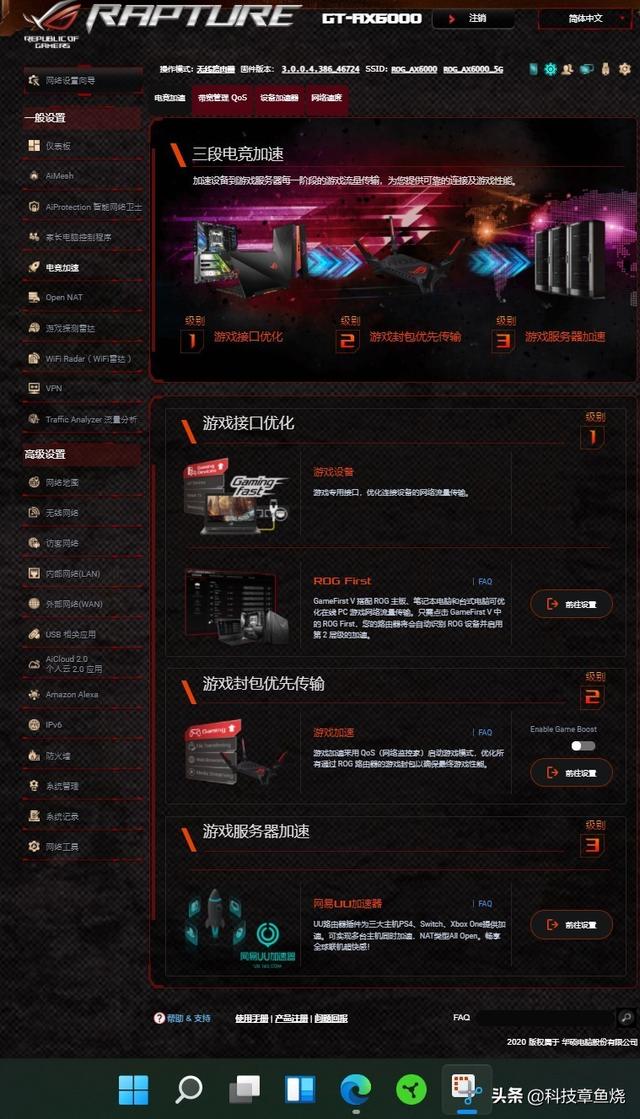 在网页端的设置中,能看到ROG AX6000对游戏网络有多方面的优化设置,其中电竞加速栏目中能看到ROG AX6000进行了“三段式”的电竞加速,例如硬件层面的游戏接口优化,当你的游戏设备接入到路由器的电竞网口或者你的电脑是ROG设备,ROG AX6000就会对你的游戏网络进行优先传输。随后的游戏封包优先传输(QOS)和游戏服务器加速(网易UU)则是从软件层面上对游戏设备的网络进行提速与确保稳定性。