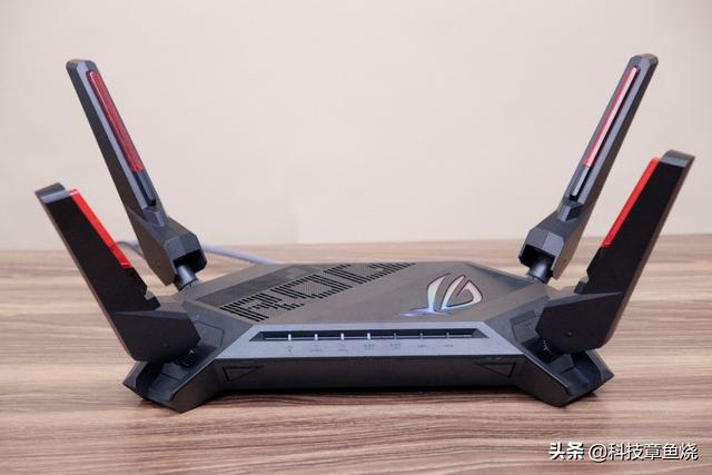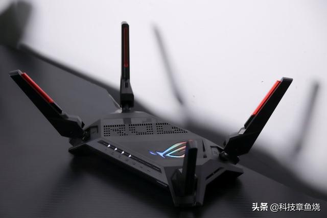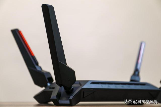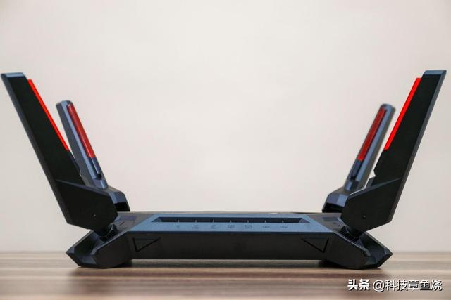 ROG AX6000的机身表面大量采用了斜切面的设计,从外延的四根天线,到机身主体都能看到这种极有科幻感的斜切面,因此路由器整体的外观设计风格就跟它的绰号“红蜘蛛”一样,黑红的配色、机甲风的横切面,再加上被暗红亚克力点缀的4根硕大天线,ROG AX6000的这一身“打扮”真的不禁让人想起《变形金刚》里以速度著称的“红蜘蛛”,放在家里瞬间就能增加那种电竞氛围感。