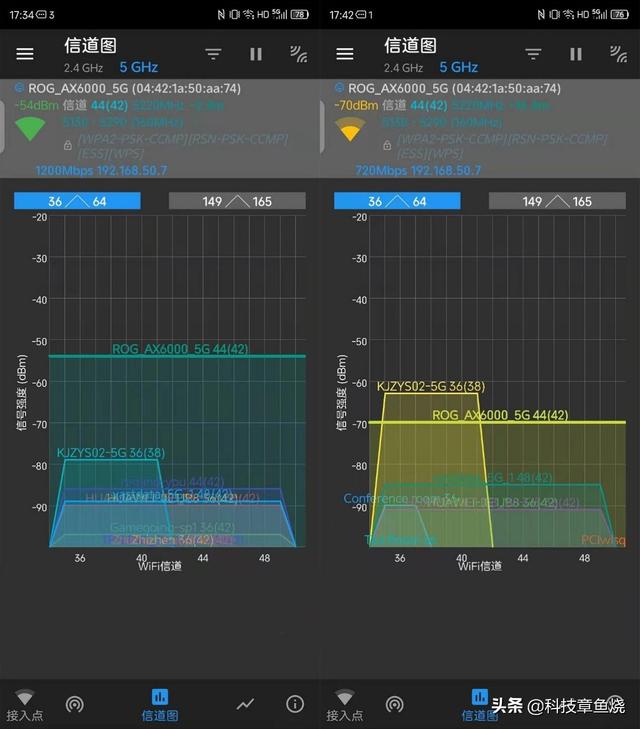 在信号强度测试中,我们测试了ROG AX6000的5G频段的信号强度,在同一场所,它的信号强度为54db,比办公室的AP信号要强上不少。而离路由器有25米左右,信号强度则降为了70db左右,和距离测试手机较近的公司WiFi的强度相差并不远。
