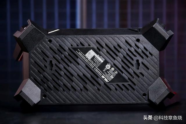 机身底部还有类似的散热设计,在路由器的底部四角,我们能看到有4个凸起的橡胶垫,它除了能让路由器能防滑之外,更重要的功能是让ROG AX6000变得悬空起来,从而让镂空的底部可以大幅度的跟外界进行空气对流。其实散热对电竞类路由器还是挺重要的,毕竟路由器一旦长时间或高负荷运行散热量就会增加,散热效果不佳的话往往就会影响路由器的网络稳定性。