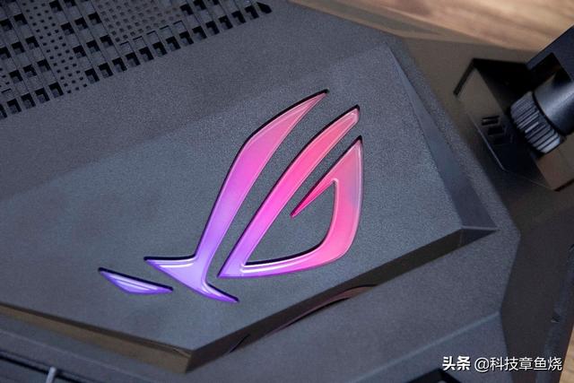 ROG AX6000身上的标志性电竞设计当然不止一个,在路由器的正面机身,还有ROG系列经典的“败家之眼”,通电使用之后,“败家之眼”会随着呼吸的节奏变幻着灯光颜色,瞬间就增加了RGB电竞氛围。在“败家之眼”的旁边还能看到“ROG”字样的镂空散热孔,这样的空隙设计确保散热所需的空气对流。