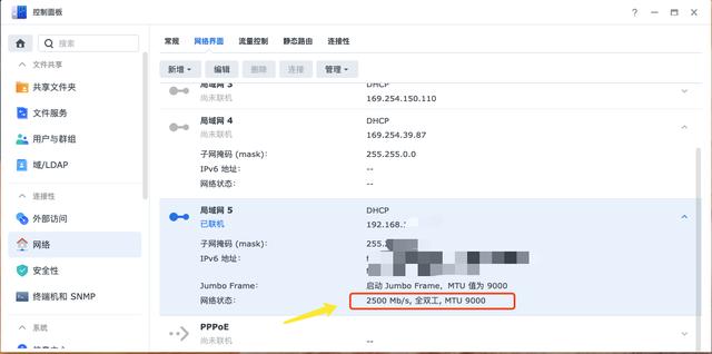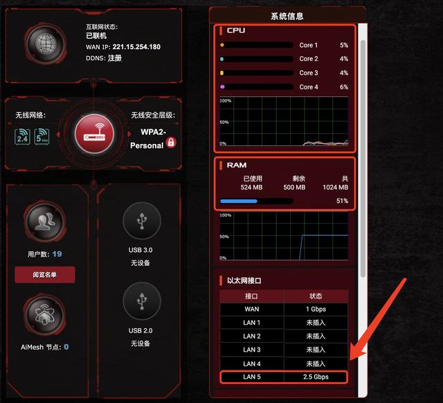 系统信息方面可以查看目前情况下CPU的占用率并不高,RAM倒是占用了一半的情况。连接方面可以看到WAN口连接为1Gbps,其中LAN5是2.5Gbps已经连接好了。