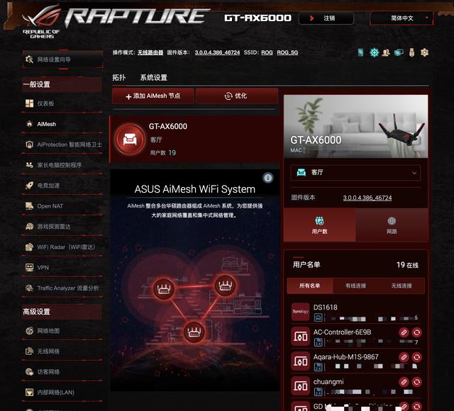 仪表盘下方就是熟悉的AiMesh设置界面了,AX6000一样支持与华硕其他支持AiMesh的路由器组成Mesh网络。值得一提的是,在目前固件版本下AX6000在AP模式下是可以用把两个2.5G网络接口作为LAN使用的。