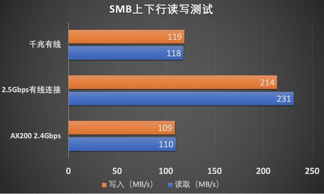 后续配合NAS测试了在2.5G有线、千兆有线以及配合AX1650X无线网卡在2.4Gbps下的上行和下行速度测试,测试NAS为群晖DS1618+搭配万兆网卡。测试硬盘是6T*6 Raid 5。可以看到在DS1618+连接速度在2500Mb/s。
