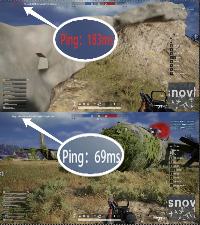 电脑端方面,还是通过《PUBG》来测试一下。毕竟如果你网速不好对于游戏体验影响还是很大的,实测在未给电脑开始游戏模式下,模拟了一个其他品牌Wi-Fi 6路由器在模拟网络下载高负载压力下的游戏环境,可以看到《PUBG》游戏中网络延迟为183ms。同样在ROG GT-AX6000模拟网络下载高负载在网页端给PC开启最高优先级后,再回到《PUBG》游戏时可以看到网络延迟明显降到了69ms。这款游戏加速还真有点厉害!