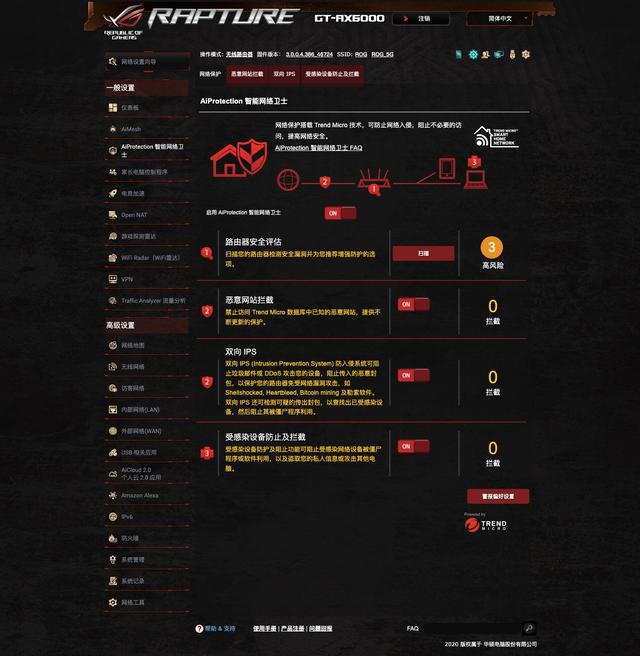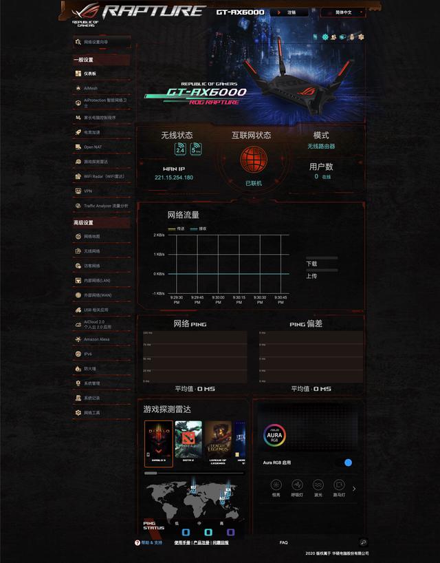 华硕的网页端管理页面可以说是最吸引玩家的一个重要卖点了,在ROG的黑红加持下让我自然地感觉换了这款路由器网络传输都更快了。在一般设置界面可以直观地看到当前网络状态、网络PING值等信息。