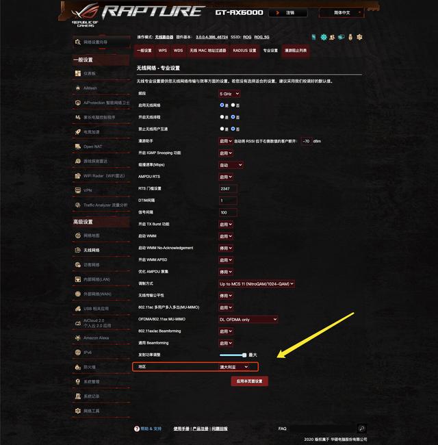 无线设置方面,我建议可以在高级设置中的专业模式下,把时区切换到澳大利亚,这样可以获得更好的信号覆盖。