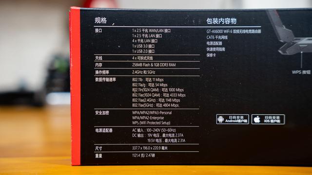 整体包装设计上还是熟悉的ROG风格,黑红的配色对我这样的玩家国度粉丝真的是杀伤力极强。价格方面“红蜘蛛”的GT-AX6000目前2499的价格对于我这个两年前4000+入手ROG GT-AX11000的用户来讲只想说“性价比啊”。