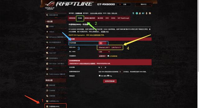 另外ROG GT-AX6000还支持双线路模式,可以根据需求设置第二个宽带。可以根据需要选择第二个宽带接口,可以任意设置LAN口或者USB接口作为网口。