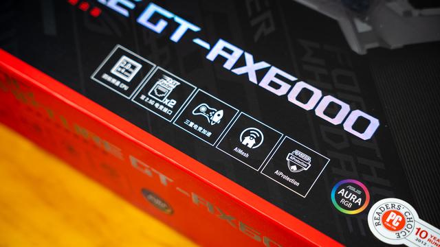 包装正面就标注了路由器的CPU最高主频2.0GHz、双2.5G电口设计、支持三重电竞加速、支持华硕自家的AiMesh以及AiProtection商用级家庭网络安全服务。对了,还有AURA信仰灯效。