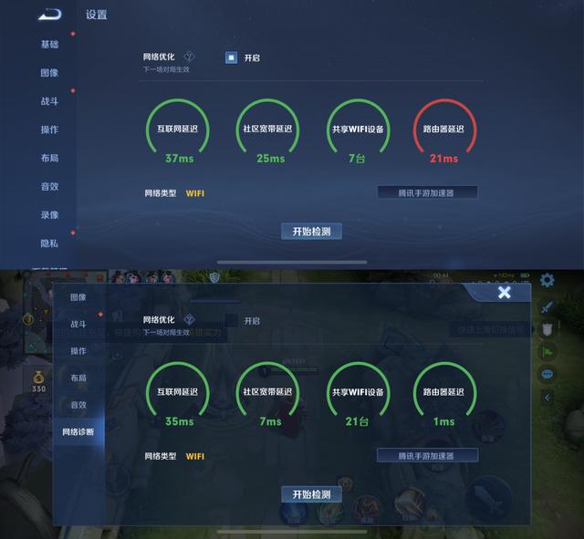 游戏测试方面,你可以根据需要选择电竞模式。如果你是手机用户可以直接在手机上操作app开启手游电竞模式。这里也通过王者荣耀对比测试看看开启手游电竞模式前后的区别。可以看到对比没有开启电竞模式下,手机即便只有7台连接设备,但是路由器延迟也有21ms,社区宽带延迟25ms。但是对比开启了电竞模式的ROG GT-AX6000可以看到路由器延迟只有1ms,社区宽带延迟7ms。