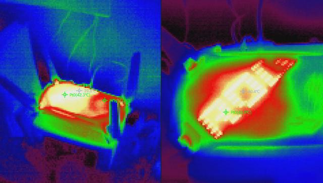 通过红外成像摄像头可以看到路由器中间区域发热较大,路由器发热最高位置为43.9℃。测试时室温25℃(北方城市家里有暖气)。希望给大家一个参考。
